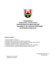 Zastupitelstvo obce Kolová Vás zve na veřejné zasedání zastupitelstva obce Kolová, které se uskuteční v pondělí 27. dubna 2026 od 19:00 hodin v předsálí Obecního úřadu Kolová, Kolová 16. Program zasedání: 1. Kontrola minulých usnesení 2. Schválení dotací z rozpočtu obce Kolová na rok 2026 3. Schválení výše školkovného pro DS Na Paloučku na školní rok 2026/2027 4. Vyhlášení výběrového řízení –Přístavba ZŠ Kolová 5. Schválení spolufinancování projektu MAS Kraj živých vod – Dr. Živoda 6. Schválení dohody – náhrada nákladů náhradní výsadby stromů