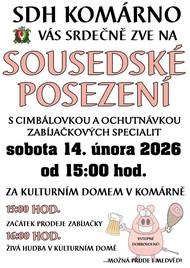 SDH Komárno zve na KARNEVAL v Komárně, který se koná 28. února 2026. Čeká vás spousta soutěží, diskotéka pro děti a bohatá tombola. Občerstvení je zajištěno a vstupné je dobrovolné.