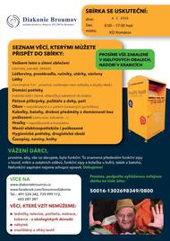 Sbírka se uskuteční v pondělí 4.5.2026. Diakonie Broumov prosí dárce o poskytnutí pouze funkčních věcí. Zaměřujeme se na oděvy se funkčními zipy a zavazadla, u kterých jsou v pořádku zipy a kolečka. Bohužel nemohou přijmout věci jako ledničky, televize, počítače ani znečištěný textil.