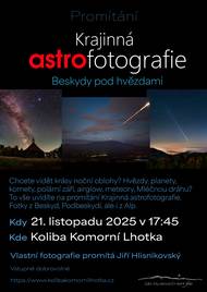 Srdečně Vás zveme na promítání krajinných astrofotografií - Beskydy pod hvězdami, dnes 21. 11. 2025 v 17.45 hodin na Kolibě Komorní Lhotka. Těšíme se na Vás.