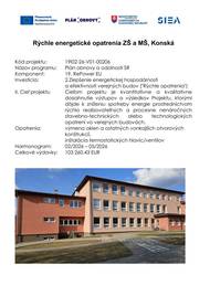 Projekt : Rýchle energetické opatrenia ZŠ a MŠ, Konská Kód projektu : 19I02-26-V01-00206 Názov programu : Plán obnovy a odolnosti SR Investícia: Zlepšenie energetickej hospodárnosti a efektívnosti verejných budov ("Rýchle opatrenia") Celkové výdavky : 103 260,43 EUR