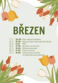 Přijďte si užít příjemné chvíle plné smíchu, tvoření, inspirace i odpočinku. Čeká nás plesová atmosféra, oslavy MDŽ, posezení u vína, dětský karneval i velikonoční tvoření. Každá akce je příležitostí potkat se, popovídat si a strávit čas v milé společnosti. Těšíme se na vás – ať je letošní březen plný pohody a krásných okamžiků ✨. Přehled akcí 7. 3. – 20:00 Ples města Kopidlna 11. 3. – 17:00 Zeptej se starosty 15. 3. – 9:00 MDŽ 19. 3. – 17:30 Na víně v knihovně 21. 3. – 15:30 Dětský karneval 24. 3. – 15:00 Zdravotní přednáška 26. 3. – 17:00 Čtení z kronik 31. 3. – 16:00 Velikonoční tvoření se zahradnickou školou