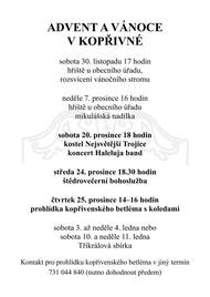 Kopřivná zve všechny na řadu vánočních akcí. Rozsvícení vánočního stromu se koná v sobotu 30. listopadu v 17 hodin na hřišti u obecního úřadu. V neděli 7. prosince od 16 hodin proběhne tradiční mikulášská nadílka. Dále si nenechte ujít koncert Haleluja band, který se uskuteční 20. prosince v 18 hodi