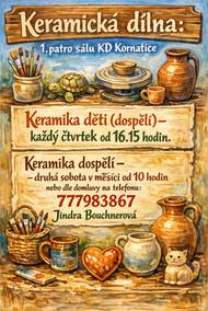 Tvoření a keramika se koná od září 2025 opět každý čtvrtek v 16:30 hodin v prvním patře KD.