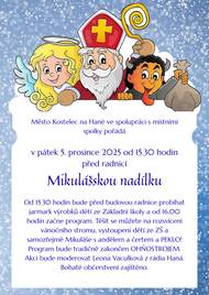 Město Kostelec na Hané ve spolupráci s místními spolky pořádá tradiční Mikulášskou nadílku, která se uskuteční v pátek 5.12.2025 před budovou radnice. Od 15:30 bude probíhat jarmark výrobků dětí ze ZŠ a v 16:00 hodin začne program.