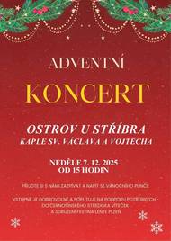 Adventní koncert se koná v neděli 7. prosince 2025 od 15:00 v kapli sv. Václava a Vojtěcha v Ostrově u Stříbra. Přijďte si s námi zazpívat a užít si vánoční punč. Vstupné je dobrovolné a bude použito na podporu potřebných, konkrétně pro černošínské středisko Vítek a sdružení Festina lente Plzeň.