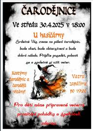 Srdečně Vás zveme na letošní pálení čarodějnic, které proběhne 30.4.2025 u hasičárny od 18.00. Přijďte posedět, pobavit se a společně si užít večer. Pro děti máme připravené večerní promítání pohádky.