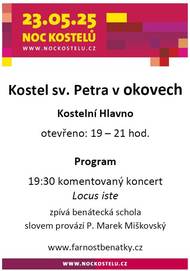 Dobrý den. Dne 23.5.2025 proběhne již 17. ročník celorepublikové akce " NOC KOSTELŮ ". Náš kostel bude otevřený od 19.00 do 21.00 a všichni jste srdečně zváni.. program viz leták . 🍀