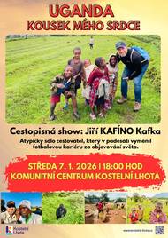 Dnes nás čeká cesta do afriky s Jiřím Kafkou. Zveme vás na dnešní cestopisnou show s názvem "Uganda, kousek mého srdce". Přednáškou nás provede Jiří KAFÍNO Kafka, atypický sólo cestovatel, který ve svých padesáti letech vyměnil fotbalovou kariéru za objevování světa. Dnes, ve středu 7. ledna 2026 od 18:00 hod v komunitním centru Přijďte si poslechnout poutavé vyprávění a prohlédnout si unikátní záběry z Ugandy. Těšíme se na vás!