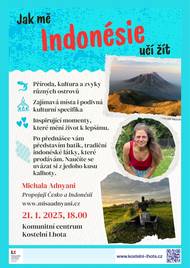 Zveme vás do našeho komunitního centra na poutavé vyprávění o zemi tisíců ostrovů. Přednáškou nás provede Michaela Adnyani, tlumočnice, průvodkyně, která Indonésii navštěvuje již od roku 2008. Dozvíte se nejen o přírodě, kultuře a zvycích různých ostrovů, ale i o inspirujících momentech, které mění život k lepšímu. Michala se s námi podělí o své zážitky ze studií v Indonésii i z cest po stopách básníka Konstantina Biebla. Po přednášce nám také představí tradiční indonéské látky (batik) a naučí nás, jak si z jednoho kusu látky uvázat kalhoty. Kdy - Středa 21. ledna 2026 od 18:00 hodin. Kde - Komunitní centrum Kostelní Lhota Bonus - Těšit se můžete na malé indonéské občerstvení Více o aktivitách přednášející najdete na www.misaadnyani.cz. Těšíme se na vás!