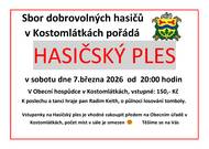 Před 2 dnyHasičský plesSbor dobrovolných hasičů v Kostomlátkách pořádá "Hasičský ples", v sobotu dne 7. března 2026 od 20 hodin v Obecní hospůdce v Kostomlátkách. Vstupné 150,- Kč.
