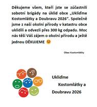 Před 1 měsícemUkliďme Kostomlátky a DoubravuÚklidová brigáda "Ukliďme Kostomlátky a Doubravu" se bude konat v sobotu 28.3.2026. Sraz účastníků v 8:30 u hasičské zbrojnice v Kostomlátkách. Více informací naleznete v přiloženém letáku.