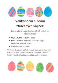Před 22 dnyVelikonoční hledání ztracených vajíčekOd 3. dubna bude pro děti připravená venkovní cesta „Velikonoční hledání ztracených vajíček po Kostomlátkách“. Začátek bude u obecního úřadu a po nalezení všech vajíček obdržíte odměnu v obecní hospůdce. Hledat ztracená vajíčka můžete od pátku 3. dubna do pondělí 6.dubna.
