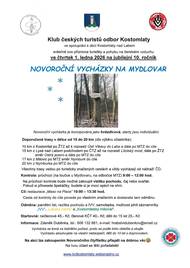 Klub českých turistů, odbor Kostomlaty, ve spolupráci s obcí Kostomlaty nad Labem srdečně zve příznivce turistiky a pohybu na čerstvém vzduchu na jubilejní 10. ročník NOVOROČNÍ VYCHÁZKY NA MYDLOVAR - ve čtvrtek, 1. ledna 2026. Na výběr je několik tras od 10 do 20 km.