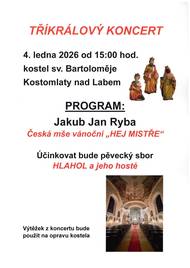 Srdečně Vás zveme na tříkrálový koncert, který se uskuteční 4. ledna 2026 od 15 hodin v místním kostele. Pěvecký sbor Hlahol a jeho hosté uvede Českou mši vánoční "HEJ MISTŘE" Jakuba Jana Ryby.
