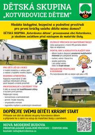 Dobrý den, zasíláme informace k zahájení provozu dětské skupiny „Kotvrdovice dětem“. Veškeré podstatné informace naleznete v přiloženém letáku. V případě potřeby upřesnění informací nás neváhejte kontaktovat na e-mailové adrese info@kotvrdovice.cz. Přednost při umístění do dětské skupiny budou mít samozřejmě děti s trvalým pobytem v Kotvrdovicích, přesto již evidujeme zájem i ze strany rodičů z okolních obcí. Děkuji LK