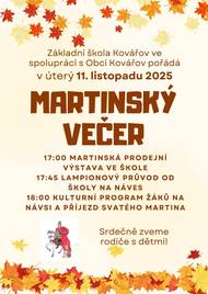 Základní škola Kovářov ve spolupráci s Obcí Kovářov pořádá v úterý 11. listopadu 2025 MARTINSKÝ VEČER. Od 17:00 proběhne ve škole prodejní výstava a v 17:45 vyjde od školy lampionový průvod. Srdečně zveme rodiče s dětmi.