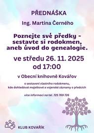 Přijďte si poslechnout přednášku pana Ing. Martina Černého o tom, jak sestavit vlastní rodokmen. Ve středu 26.11. od 17:00 v Obecní knihovně v Kovářově