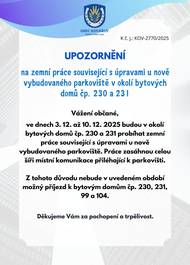 Ve dnech 3. 12. až 10. 12. 2025 budou v okolí bytových domů čp. 230 a 231 probíhat zemní práce související s úpravami u nově vybudovaného parkoviště. Práce zasáhnou celou šíři místní komunikace přiléhající k parkovišti.
