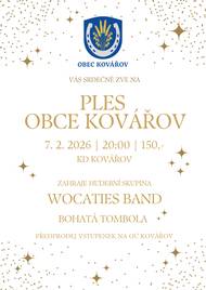 Obec Kovářov vás srdečně zve na ples, který se koná v sobotu 7.2.2026 od 20:00 v KD Kovářov. K tanci i poslechu zahraje hudební skupina Wocaties Band. Těšit se můžete na bohatou tombolu i předtančení.