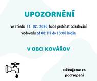 Ve středu 11. 02. 2026 bude probíhat odkalování vodovodu v obci Kovářov od 08:13 do 13:00 hodin. Děkujeme za pochopení.