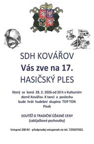 SDH Kovářov vás srdečně zve na ples, který se koná v sobotu 28.2.2026 od 20:00 v KD Kovářov. K tanci i poslechu zahraje kapela TOP TON Písek.
