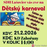 SDH Lašovice vás srdečně zve na Dětský karneval, který se koná 21. 2. 2026 od 14:00 v KD Zahořany. Letos se můžete těšit na obsluhu ve stylu večerníčků.