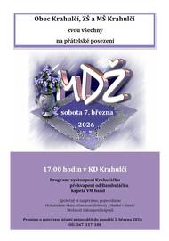 Obec Krahulčí a ZŠ a MŠ Krahulčí zve všechny v sobotu 7. března 2026 na přátelské posezení a oslavu MEZINÁRODNÍHO DNE ŽEN - začátek v 17.00 hodin v Kd Krahulčí - k poslechu a tanci hraje VM band - zveme ženy i muže všech věkových kategorií, přijďte posedět, popovídat, pobavit se a zatančit si - možno přinést vlastní slané i sladké dobroty, nápoje budou zajištěny - účast prosíme potvrdit nejpozději do 2. března tel. na 567 317 108, e-mailem na obec@krahulci.cz , nebo vhoďte lístek s jmény přihlášených účastníků do schránky na OÚ