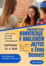 Nabízíme občanům odpolední kurz konverzace v anglickém jazyce s Evou Bennett pro mírně pokročilé i věčné začátečníky, koná se každý čtvrtek od 16.00 do 17.00 hodin v ZŠ Krahulčí. Začínáme 23.4. 2026. Plakát v příloze. Kontakt: reditel@zsmskrahulci.cz