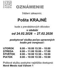 Prevádzkové hodiny POŠTA KRAJNÉ v období 24.2.2026 - 27.2.2026