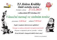 Před 16 dnyVánoční turnaj ve stolním teniseOddíl stolního tenisu Králíky s podporou města Králíky pořádá 27. prosince 2025 od 9:00 hod tradiční Vánoční turnaj ve stolním tenisu. Přijďte se rozhýbat v povánočním čase nebo jen tak podívat na dobrý stolní tenis. Občerstvení pro všechny je zajištěno.