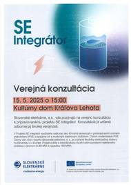 Slovenské elektrárne, a.s. pozývajú občanov dňa 15. mája 2025 o 15.00 hod. na verejnú konzultáciu k pripravovanému projektu SE Integrátor. Konzultácia sa uskutoční v Kultúrnom dome Kráľova Lehota, je určená odbornej a širokej verejnosti.