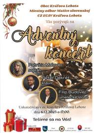 Obec Kráľova Lehota, Miestny odbor Matice slovenskej, CZ ECAV Kráľova Lehota Vás pozývajú na Adventný koncert, ktorý sa uskutoční dňa 6.12.2025 (sobota) o 17.00 hod. v evanjelickom kostole v Kráľovej Lehote.