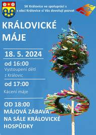 Tímto všechny zveme na Královické MÁJE, které se uskuteční 24.5.2025 od 16 hod. před Královickou hospůdkou.