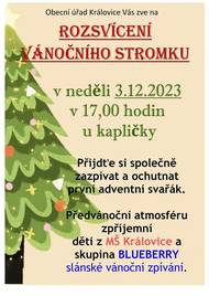 Obecní úřad Královice Vás zve na "Rozsvícení vánočního stromku" v neděli 3.12.2023 v 17,00 hod. u kapličky.