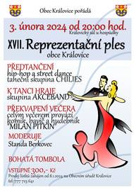 Tímto Vás srdečně zveme na již XVII. Reprezentační ples obce Královice, který se uskuteční 03.02.2024.