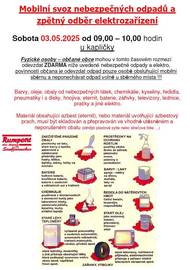 Mobilní svoz nebezpečného odpadu proběhne dne 3.5.2025 od 09,00-10,00 hodin u kapličky.