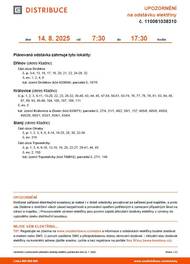 Upozornění na odstávku eletkřiny dne 14.08.2025 od 7:30 do 17:30 hod. Plánovaná odstávka zahrnuje tyto lokality: Královice (okres Kladno) č. p. 1, 2, 3, 5-11, 13-20, 22, 23, 26-32, 36-40, 43, 44, 45, 47-54, 56-61, 63-74, 76, 77, 78, 79, 81, 83, 84, 85, 87, 89, 93, 95-99, 104, 105, 107, 108, 111 č. ev. 5 kat. území Královice u Zlonic (kód 633071): parcelní č. 27/4, 31/1, 40/2, 58/1, 137, 495/6, 495/8, 495/9, 495/26, 663/1, 833/1, 834/1, 834/4 více na: https://www.cezdistribuce.cz/cs/pro-zakazniky/potrebuji-vyresit/stavajici-pripojeni/overeni-planovane-odstavky