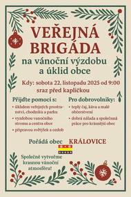 sobotu 23.listopadu 2024 se bude konat veřejná brigáda na vánoční výzdobu a úklid obce. Sraz je v 9,00 hodin před kapličkou. Všem, kteří se zúčastní veřejné brigády předem moc děkujeme. Zastupitelé obce Královice