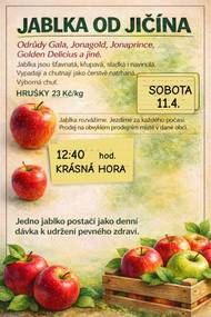 Krasna Hora: Vazeni, v sobotu 11. 4. od 12:40 hod. probehne v Krasne Hore na obvyklem miste prodej jablek z Jicina. Cena 23 Kc/kg. Prejeme hezky den.