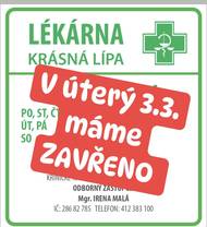 Z důvodu školení zaměstnance městské policie na odchyt psů budou úřední hodiny v týdnu od 16. do 20. března 2026 pouze v pátek 20. března od 14:00 do 16:00. Děkujeme za pochopení. Informace o Městské policii Krásná Lípa najdete na našem webu zde: https://krasnalipa.cz/mestska-policie.php