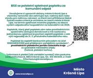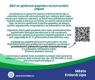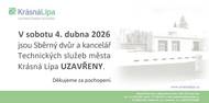 Před 1 měsícemZahájení svozu biodpadu v roce 2026 a změna svozového dne!Pravidelný svoz biologicky rozložitelných odpadů rostlinného původu v hnědých nádobách přímo od občanů bude v letošním roce zahájen ve čtvrtek 2. 4. 2026. Den svozu je vždy ve čtvrtek v sudém týdnu od 6:00 hodin do 20:00 hodin. probíhat bude do konce listopadu 2026 (dle klimatických podmínek). Podrobnější informace – Lenka Fritscheová, MěÚ Krásná Lípa, tel. 412 354 833, 778 757 426, e-mail fritscheova@krasnalipa.cz