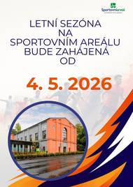 Před 1 měsícem☀️ LETNÍ SEZÓNA STARTUJE od 4. 5. 2026Sportovní areál otevírá své brány v letní sezóně od 4. 5. 2026, denně 9 - 21h a zve všechny sportovce i rekreační nadšence. Přijďte si zahrát, zatrénovat nebo si jen užít aktivní den venku. Těšíme se na vás při zahájení letní sezóny!