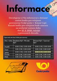 Před 1 dnemPEKLO SEVERU - INFORMACE V KOSTCEV sobotu 25. dubna 2026 se bude konat silniční cyklistický závod Peklo Severu Road ŠKODA Cup - Český pohár mužů Elite a hobby závodníků. Závod má podtitul - Velká cena Nobilis Tilia a O putovní pohár starosty města Krásná Lípa Jana Koláře. Jedná se o nejvyšší národní soutěž s mezinárodní účastí. Veškeré informace (mapy a časové itineráře) naleznete na webu https://www.pekloseveruroad.cz/cz/ Zde nejdůležitější body: 1) Start závodu proběhne v 11 hodin (Elite) a v 11:10 (Hobby) u společnosti Nobilis Tilia na Vlčí Hoře. 2) Okruh vede z Vlčí Hory přes Brtníky, Kunratice, Šluknov, Staré Křečany do Zahrad a cíl je na Vlčí Hoře opět u společnosti Nobilis Tilia. 3) Hobby závodníci objedou 3 okruhy a budou v cíli kolem 13. hodiny. Elitní závodníci pojedou 7 okruhů a budou v cíli přibližně v 14:30-15:00. 4) Uvedený okruh bude pro civilní dopravu otevřen pouze po směru závodu. Respektujte prosím instrukce regulovčíků na křižovatkách (Policie ČR, Městská policie, hasiči a dobrovolníci). Křižovatky budou řízeny tzv. plovoucí uzávěrou, tzn. že 10 minut před čelem závodu pojede policejní vůz s červených praporkem, ten uzavře civilní provoz ve všech směrech, 10 minut po průjezdu hobby pelotonu pojede policejní vůz se zeleným praporkem, který opět civilní provoz otevře ve směru závodu. Objížďky naleznete i na webu https://www.pekloseveruroad.cz/cz/ pod odkazem Dopravní linka tel. 771 199 502. V případě dotazu na objížďky vám poradíme v sobotu i na tomto telefonním čísle.