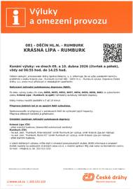 Před 1 měsícemRádi bychom Vás informovali o výlukách,které nám oznámil provozovatel dráhy na území Německa DB InfraGo AG. Na trati 083 Děčín - Bad Schandau - Dolní Poustevna - Rumburk Výluky budou probíhat v úseku Schöna - Bad Schandau - Dresden Hbf.. Po dobu výluk budou dotčené vlaky linky U28 relace Děčín hl.n. - Bad Schandau s Dolní Poustevna s Rumburk, nahrazeny náhradní autobusovou dopravou v úseku Děčín hl.n. s Bad Schandau a zpět. V úseku Děčín hl.n. - Dolní Žleb - Schöna, bude vlaková doprava zachována. Náhradní autobusová doprava bude organizována podle přiložených výlukových jízdních řádů. OPATŘENÍ V REGIONÁLNÍ DOPRAVĚ: o nocích z 11./12., z 12./13. a z 16./17. března 2026 VJŘ_083_Děčín-Bad Schandau_FPLO 41153+40487 březen .pdf ve dnech 17. s 22. března 2026 v době od 9:00 hod. do 17:00 hod. VJŘ_083_Děčín-Bad Schandau_FPLO 40488 březen.pdf CESTUJÍCÍ JEDOUCÍ: = ze stanice Děčín hl. n. do stanic Rathmannsdorf (Pirna), Goßdorf-Porschdorf (Pirna), Kohlmühle, Ulbersdorf, Amtshainersdorf a Sebnitz využijí náhradní autobusovou dopravy ze stanice Děčín hl.n., přestup mezi autobusem a vlakem po trase není později možný. = ze stanice Sebnitz, Amtshainersdorf, Ulbersdorf, Goßdorf-Kohlmühle, Porschdorf (Pirna) a Rathmannsdorf (Pirna) do stanice Děčín hl. n. využijí náhradní autobusovou dopravy ze stanice Rathmannsdorf, přestup mezi autobusem a vlakem po trase není později možný. ve dnech 16., 23., 30. března a 13. dubna 2026 (pondělí) v době od 10:30 hod. do 17:00 hod. Výluky budou probíhat vždy v pondělí až do 7. prosince 2026 (mimo 6. dubna a 25. května)! Z důvodu dalších výluk na území Německa, které se významně dotknou regionální dopravy, Vám nyní zasílám výlukový jízdní řád platný na dny pondělí pouze do 13. dubna 2026. VJŘ_083_Děčín-Bad Schandau_ZP (pondělí) Německo březen-duben.pdf CESTUJÍCÍ JEDOUCÍ: = ze stanice Děčín hl. n. do stanic Rathmannsdorf (Pirna), Goßdorf-Porschdorf (Pirna), Kohlmühle, Ulbersdorf, Amtshainersdorf a Sebnitz využijí náhradní autobusovou dopravy ze stanice Děčín hl.n., přestup mezi autobusem a vlakem po trase není později možný. = ze stanice Sebnitz, Amtshainersdorf, Ulbersdorf, Goßdorf-Kohlmühle, Porschdorf (Pirna) a Rathmannsdorf (Pirna) do stanice Děčín hl. n. využijí náhradní autobusovou dopravy ze stanice Rathmannsdorf, přestup mezi autobusem a vlakem po trase není později možný. UPOZORNĚNÍ k lince RE20 Vlak Os 5278 relace Litoměřice - Ústí nad Labem - Dresden pojede o víkendu 28. a 29. března ze stanice Děčín hl.n. o 10 minut později - v 17:37 hod.! VJŘ_083_Děčín-Bad Schandau_FPLO 40356_březen.pdf OPATŘENÍ V DÁLKOVÉ DOPRAVĚ: ve dnech 11. – 13. března 2026 a dále dne 16. března 2026 = vlaky railjet 170 a 179 budou v úseku Děčín hl.n. - Dresden Hbf. zrušeny a nahrazeny náhradní autobusovou dopravou v úseku Ústí nad Labem hl. n. – Dresden Hbf a zpět. = vlak nightjet 457 pojede v úseku Berlin Hbf. - Děčín hl.n. v dřívější časové poloze. DB_VJŘ_11._13.3.2026.pdf , DB_VJŘ_16.3.2026.pdf ve dnech 18. – 21. března 2026 = vlaky railjet 170 a 179 budou v úseku Děčín hl.n. - Dresden Hbf. zrušeny a nahrazeny náhradní autobusovou dopravou v úseku Ústí nad Labem hl. n. – Dresden Hbf a zpět, = vlak railjet 250 pojede v úseku Praha-Holešovice – Děčín hl. n. v pozdější časové poloze, = vlak EC 458 pojede v úseku Praha hl. n. – Dresden Hbf. v dřívější časové poloze, = vlak nightjet 457 pojede Berlín Hbf. – Děčín hl. n. v dřívější časové poloze. DB_VJŘ 18._21. březen 2026.pdf vždy v pondělí od 16. března 2026 s 7. prosince 2026 (mimo 6. dubna a 25. května) v úseku Schöna - Bad Schandau - Dresden. Dotčené vlaky railjetlinky Ex5 relace Praha - Berlin - Hamburg - Koebenhavn budou v úseku Děčín hl.n. - Dresden Hbf. odřeknuty. Za vlaky bude zavedena náhradní autobusová doprava v úseku Ústí nad Labem hl.n. - Dresden Hbf. a zpět. Ve stani