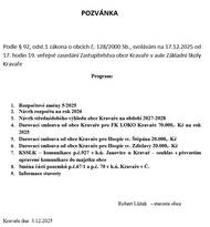 Pozvánka na 19. veřejné zasedání Zastupitelstva obce Kravaře dne 17.12.2025 od 17 h v aule Základní školy Kravaře.