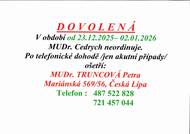 MUDr. Cedrych v období od 23.12.2025 - 2.1.2026 neordinuje.