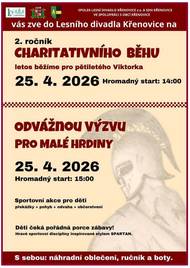 Spolek,,Lesní divadlo Křenovice" a obec Křenovice zvou všechny zájemce o pohyb a zábavu,děti i dospělé, do Lesního divadla v Křenovicích.V sobotu 25. 4. 2026 zde proběhne 2.ročník Charitativního běhu,tentokrát pro pětiletého Viktorka,a poté odvážná výzva pro malé hrdiny. Celá akce odstartuje ve 14 hodin.Občerstvení je zajištěno.