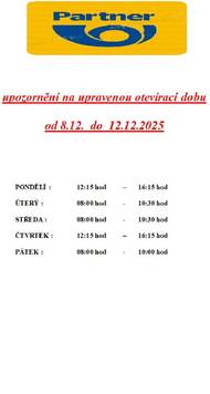 Od 8. do 12. prosince 2025 dojde k úpravě otevírací doby. Otevírací hodiny se mění následovně: v pondělí od 12:15 do 16:15 hodin, úterý a středa od 08:00 do 10:30 hodin, čtvrtek od 12:15 do 16:15 hodin a v pátek od 08:00 do 10:00 hodin.
