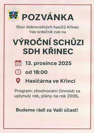 SDH Křinec oznamuje, že v sobotu 04.10. 2025 od 9.00 do 11.00 hod. bude opět možné odložit vysloužilý elektroodpad v areálu bývalé Správy silnic na Zeleném náměstí čp. 139 v Křinci. Nově bude možné odložit i železný odpad
